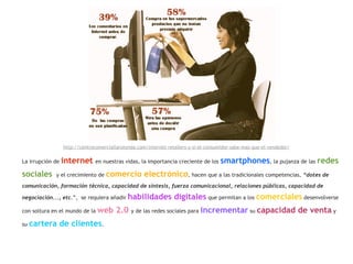 Este documento propone que los vendedores deben adquirir habilidades digitales para aprovechar mejor los recursos de Internet y las redes sociales con el fin de incrementar sus ventas y cartera de clientes. Describe varias herramientas de la web 2.0 como el email marketing, publicidad en Internet, webinarios y presentaciones en línea que los vendedores pueden utilizar, así como estrategias de inbound marketing como crear un blog y usar LinkedIn y Twitter para generar confianza y estar más cerca de los clientes.