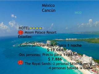 El documento lista opciones de viaje a México, España y Estados Unidos, incluyendo precios para hoteles en Cancún y Barcelona, y vuelos de ida y vuelta a México y Nueva York para diferentes fechas. Se proporcionan detalles como precios por noche para dos o cuatro personas en dos hoteles de Cancún, y precios de vuelos para un adulto entre noviembre de 2016 y febrero de 2017.