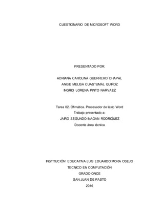 Este documento presenta un cuestionario sobre Microsoft Word realizado por tres estudiantes para una clase de ofimática. El cuestionario contiene preguntas sobre qué es un procesador de texto y Word, los diferentes procesadores de texto disponibles, cómo ingresar a Word, los formatos de archivo compatibles con Word, los elementos del entorno de Word y las diferentes versiones de Word a través del tiempo.