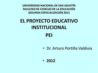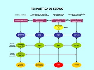 Este documento presenta el Proyecto Educativo Institucional (PEI) de una institución educativa. Explica que el PEI es un instrumento de gestión que orienta los procesos pedagógicos, institucionales y administrativos de la escuela de manera coherente y participativa. Luego describe los componentes del PEI como la identidad, diagnóstico, propuesta pedagógica, propuesta de gestión y resultados, así como las etapas y herramientas para elaborar el PEI. Finalmente, detalla conceptos clave como misión, vis