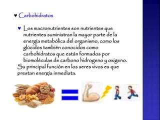 El documento habla sobre los carbohidratos y sus propiedades. Explica que los carbohidratos son macronutrientes que proporcionan energía y están formados por carbono, hidrógeno y oxígeno. Menciona ejemplos como la glucosa y la fructosa y señala que los carbohidratos pueden ser insolubles o fermentables. También analiza los beneficios y daños de consumir carbohidratos en exceso.