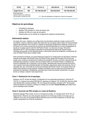 Este documento describe una actividad de Packet Tracer que involucra completar una topología de red estándar agregando dispositivos y conexiones. Los estudiantes enviarán paquetes entre dispositivos y analizarán su viaje a través de la red usando el modo de simulación de Packet Tracer. El objetivo es que los estudiantes se familiaricen con la configuración y uso del modelo de laboratorio estándar de Packet Tracer.