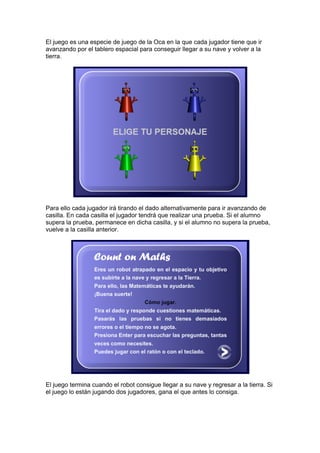 Este documento describe un juego interactivo llamado "Count on Maths" que permite practicar el cálculo mental en la educación secundaria obligatoria. El juego puede jugarse de forma individual o en parejas, en dos idiomas y niveles de dificultad. Los jugadores avanzan tirando un dado y respondiendo preguntas de matemáticas para llegar a su nave espacial. El juego incluye cinco tipos de pruebas sobre diferentes temas matemáticos.