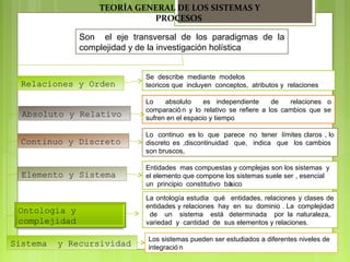 Este documento describe diferentes paradigmas de investigación social como los sistemas, el holismo, el pensamiento sistémico y la complejidad. Explica conceptos clave como absolutoy relativo, continuo y discreto, elemento y sistema. Además, presenta referencias bibliográficas y cibergráficas sobre estos temas.