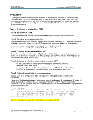 Este documento describe cómo configurar la autenticación PAP y CHAP en una topología de red que incluye routers R1, R2 y R3. Se configura OSPF para enrutamiento. Luego, se configura PAP entre R1 y R2 usando nombres de usuario y contraseñas. Finalmente, se configura CHAP entre R2 y R3 también usando autenticación con nombre de usuario y contraseña.