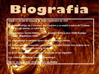 Miguel de Cervantes nació en 1547 en Alcalá de Henares, España. Fue un soldado, novelista, poeta y dramaturgo conocido principalmente por haber escrito Don Quijote de la Mancha. Algunas de sus otras obras importantes incluyen La Galatea, Novelas ejemplares y Los trabajos de Persiles y Sigismunda. Murió en 1616 en Madrid a la edad de 68 años.