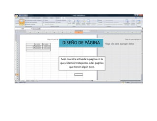 Excel tiene varias vistas para mostrar hojas de cálculo, incluyendo la vista normal que muestra una grilla con encabezados de columnas y filas, la vista de diseño de página que solo muestra las páginas con datos, y la vista previa de salto de página que marca líneas alrededor de las secciones que cabrán en una página de impresión. La pantalla completa oculta menús y elementos para enfocarse solo en las celdas de trabajo.