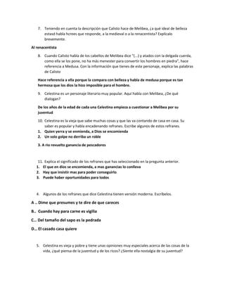 Este resumen describe un documento que contiene preguntas sobre la obra La Celestina de Fernando de Rojas. El documento incluye preguntas sobre el siglo en que vivió el autor, la forma del texto (diálogo), las características de los diálogos, de qué trata la obra, los recursos expresivos que utiliza Calisto para describir a Melibea, el uso de palabras por parte de Sempronio, a qué ideal de belleza responde la descripción de Melibea, la referencia a Medusa en la descripción de los cabellos de Melibea,