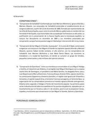 Este documento presenta un ensayo sobre la independencia de México basado en los pasos del Discurso del Método de Descartes. Describe las conspiraciones iniciales, los personajes más importantes como Hidalgo, Allende y Morelos, y las etapas clave de la independencia desde el Grito de Dolores hasta la consumación bajo el Plan de Iguala y el reconocimiento internacional de México como nación independiente. El autor concluye que este enfoque le permitió comprender mejor este importante momento histórico de México.
