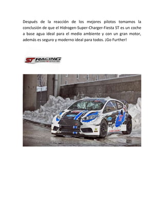 El documento describe el nuevo modelo Hidrogen-Super-Charger-Fiesta ST de Ford y R-M-P, un automóvil propulsado por agua con un motor supercargado que aumenta la potencia sin necesidad de gasolina. El coche ofrece mayor rendimiento y ayuda al medio ambiente sin sacrificar potencia, lo que lo hace ideal para hombres que buscan economizar. Las pruebas de pilotos profesionales concluyeron que es un vehículo seguro, moderno y respetuoso con el medio ambiente.