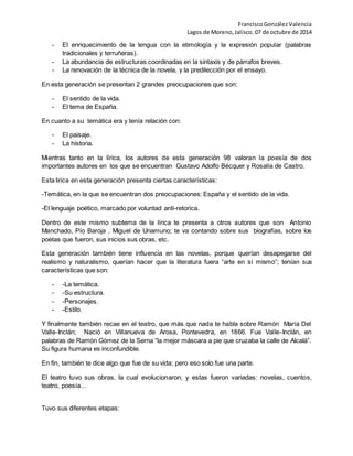 La Generación del 98 surgió en España a finales del siglo XIX como reacción a la crisis política y cultural de la época. Estaba formada por un grupo de escritores como Miguel de Unamuno, Pío Baroja y Antonio Machado, que buscaban una actitud más crítica y radical en la sociedad. Se caracterizaron por renovar los estilos literarios, abordando temas como el sentido de la vida y la situación de España, con un lenguaje sencillo y popular. Influyeron en géneros como la lírica, la novela y el teatro, donde