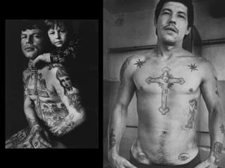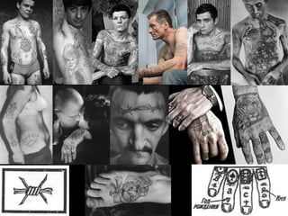 El documento describe diferentes tatuajes y sus significados en la cultura criminal rusa. Algunos tatuajes simbolizan el tiempo pasado en prisión, como estrellas o triángulos de colores. Otros representan el estatus o crímenes cometidos, como cuervos, crucifijos, calaveras o cuchillos. La mayoría transmiten un mensaje de libertad, fuerza o lealtad al mundo criminal.