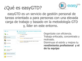 EasyGTD es un servicio en línea basado en la metodología GTD para la gestión de tareas personales y proyectos. Ofrece cinco pasos para organizar el trabajo: capturar ideas, clarificar acciones, organizar tareas por proyectos, completar acciones, y revisar periódicamente el sistema. Además, provee cursos, videos y una comunidad para apoyar la productividad de usuarios con altas cargas de trabajo.