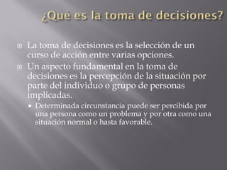 Este documento describe el proceso de toma de decisiones en las organizaciones. Explica que existen dos tipos de decisiones: las programadas, que involucran situaciones recurrentes, y las no programadas, que requieren una solución específica. También detalla las etapas del proceso de toma de decisiones: búsqueda de información, formulación del problema, evaluación de alternativas, elección de la mejor opción e implementación. Finalmente, señala que la toma de decisiones implica ciertos riesgos y grados de incertidumbre.