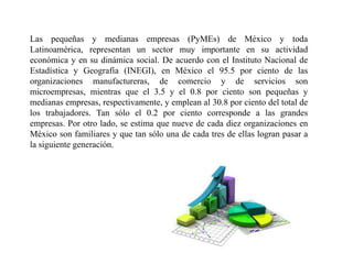 Las pequeñas y medianas empresas (PyMEs) representan la mayoría de las empresas en México y emplean al 30.8% de los trabajadores. Sin embargo, sólo una de cada tres PyMEs familiares logra pasar a la siguiente generación. Las PyMEs tienen ventajas como su contribución al desarrollo económico y empleo, pero también desventajas como la dificultad de contratar personal especializado y realizar inversiones para mejorar. Es importante apoyar a las PyMEs para aprovechar su potencial y hacer de México un país más competitivo