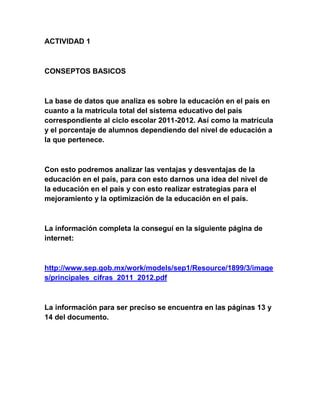 El documento analiza los datos de matrícula del sistema educativo mexicano en el ciclo escolar 2011-2012, incluyendo la matrícula total y el porcentaje de estudiantes por nivel educativo. La información proviene de páginas 13 y 14 de un documento de la Secretaría de Educación Pública. El análisis de estos datos puede identificar fortalezas y áreas de oportunidad para mejorar la educación en México.
