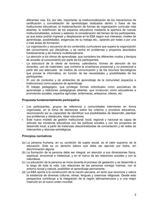 La educación básica alternativa (EBA) tiene como prioridad la educación de grupos vulnerables y excluidos del sistema educativo tradicional. La EBA atiende a una demanda diversa y compleja, ofreciendo modelos flexibles que respetan las diferencias individuales. La EBA se organiza en programas, ciclos y grados, y busca desarrollar la identidad personal y cultural de los participantes, así como sus habilidades ciudadanas, laborales y de responsabilidad social. La propuesta curricular de la EBA continúa en construcción para mejor atender a la