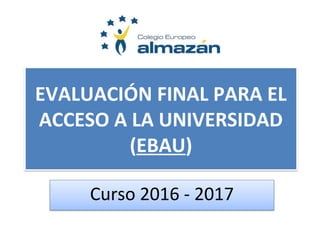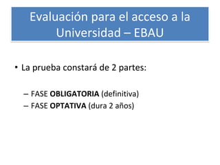 La EBAU consta de dos fases: una obligatoria y otra optativa. La fase obligatoria evalúa cuatro asignaturas y debe aprobarse con una nota mínima de 4. La fase optativa permite sumar hasta 4 puntos extra examinándose de dos asignaturas de Bachillerato. La nota final de admisión a la universidad se calcula como un porcentaje de la nota media de Bachillerato y la calificación de la fase obligatoria, sumando puntos adicionales por las calificaciones de la fase optativa.