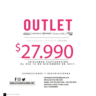 El documento presenta una variedad de prendas de vestir como blusas, jeans, vestidos y pantalones en oferta. Se ofrecen descuentos de hasta un 40% con entrega a todo el país e inicio de facturación el 15 de diciembre de 2017. Se incluyen contactos y condiciones de la venta por catálogo.