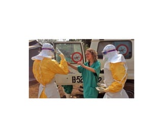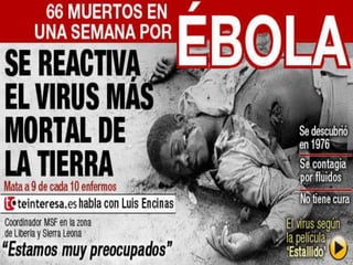 El documento describe el virus del Ébola, incluyendo su origen, síntomas, transmisión, tratamiento y protocolos de actuación en caso de brote. El virus del Ébola causa fiebre hemorrágica y se transmite a humanos por contacto con animales infectados, propagándose entre personas a través de fluidos corporales. No existe un tratamiento específico y los protocolos en caso de brote incluyen aislamiento, equipo de protección para el personal médico, y medidas de prevención y desinfección.