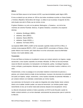 El documento proporciona información sobre el virus del Ébola, incluyendo su descubrimiento, transmisión, síntomas, diagnóstico y prevención. El virus del Ébola causa una enfermedad hemorrágica grave conocida como fiebre de Ébola y se transmite a través del contacto directo con fluidos corporales o materiales contaminados. Actualmente no existe una vacuna aprobada para su uso, por lo que la prevención se centra en medidas de higiene y control de infecciones.