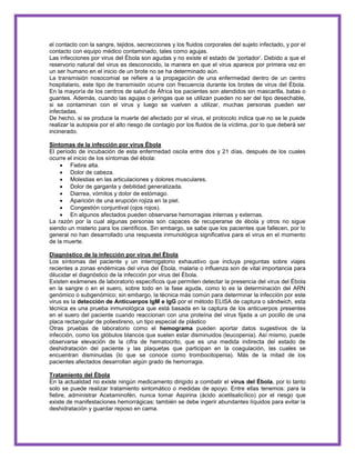 El documento describe la enfermedad del ébola, incluyendo su historia, síntomas, transmisión, diagnóstico y tratamiento. El ébola es un virus hemorrágico que se transmite a humanos a través de animales infectados o contacto directo con fluidos corporales de personas infectadas. Provoca fiebre alta y hemorragias internas y externas, y tiene una alta tasa de mortalidad. Actualmente no existe una vacuna o tratamiento específico, solo medidas de apoyo. El brote más grande actualmente se encuentra en África occidental.