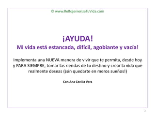 El documento describe el sistema de Reingeniería de Vida creado por Ana Cecilia Vera para ayudar a las personas a tomar el control de su destino y manifestar lo que desean en sus vidas de forma sistemática. Explica cómo ella desarrolló este sistema después de experimentar dificultades para aplicar sus conocimientos de coaching y cómo esto transformó positivamente su vida y la de sus clientes.
