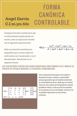 Este documento describe diferentes formas canónicas para representar sistemas en espacio de estados, incluyendo la forma canónica controlable, la forma de Jordan, y la forma canónica observable. Explica que la forma canónica controlable garantiza que el modelo resultante es controlable, la forma de Jordan se compone de bloques de Jordan en la diagonal para sistemas no diagonalizables, y la forma canónica observable asegura que los estados internos puedan inferirse a partir de las salidas externas.