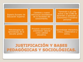 El documento aborda la orientación académica y profesional en el bachillerato, enfatizando una metodología de aprendizaje basada en problemas dentro del nuevo espacio europeo de educación superior. Se destaca la importancia de la autonomía del alumnado, la vinculación con el mercado laboral y el uso de nuevas metodologías interactivas y colaborativas para preparar a los estudiantes para su futura vida profesional. Además, se proponen diversas actividades y tareas que facilitan la toma de decisiones y el desarrollo de un perfil vocacional adecuado.