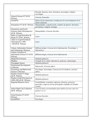 Este documento presenta una lista de bases de datos de EBSCO que contienen artículos de texto completo en varias disciplinas, incluyendo ciencias, negocios, educación, humanidades, ciencias sociales, psicología, medicina y más. Cada base de datos se describe brevemente por su ámbito temático.