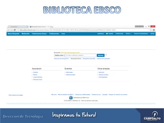 EBSCO es el líder mundial en información y provee servicios de consultoría y tecnología avanzada para acceder a contenidos de calidad, incluyendo publicaciones impresas, electrónicas, bases de datos de referencia e investigación, libros de audio y más. EBSCOhost es la plataforma más utilizada para realizar búsquedas en EBSCO, la cual contiene más de 350 bases de datos en todos los campos de estudio e investigación. El documento explica cómo ingresar a EBSCOhost a través de la página de la biblioteca