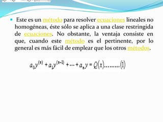 El método de los coeficientes indeterminados se usa para resolver ecuaciones lineales no homogéneas mediante la aplicación de un operador para anular el término no homogéneo y obtener una ecuación auxiliar de orden mayor que se resuelve. Luego, se determinan los coeficientes indeterminados sustituyendo en la ecuación original.