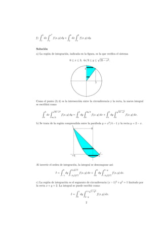 Este documento presenta varios ejercicios sobre el cálculo de integrales dobles sobre diferentes regiones. Se proporcionan los límites de integración para regiones como un trapecio, un segmento parabólico, círculos y más. También se piden cambiar el orden de integración y calcular valores numéricos de integrales dobles sobre estas regiones.