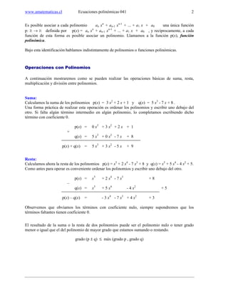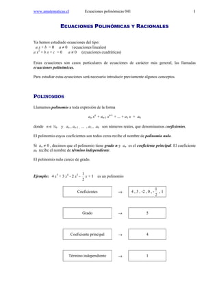 El documento explica conceptos básicos sobre ecuaciones polinómicas y racionales. Define polinomios y sus operaciones de suma, resta, multiplicación y división. Luego, introduce las raíces de un polinomio y las ecuaciones polinómicas, así como la divisibilidad y factorización de polinomios, que son útiles para encontrar las raíces de un polinomio.