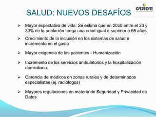 La Cámara Argentina de Insumos y Equipamiento Médico (CADIEM) reúne a empresas del sector de productos médicos de diversos tamaños. Los desafíos en salud incluyen el envejecimiento poblacional, la mayor exigencia de los pacientes y la escasez de médicos. La tecnología de la información médica puede optimizar procesos, reducir costos y mejorar la calidad y seguridad de la atención.