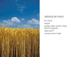 El documento analiza diversos medios de pago virtuales, incluyendo PayPal, Google Wallet y Apple Pay, destacando sus ventajas como la rápida integración y el diseño que genera confianza. También menciona la persistencia de métodos tradicionales y la importancia de equilibrar usabilidad y seguridad en las transacciones. Se señala el futuro de los pagos móviles y la preocupación por las comisiones y la privacidad de los datos.
