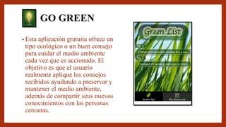 Este documento presenta cuatro aplicaciones móviles relacionadas con la ecología. "Go Green" ofrece consejos ecológicos diarios y permite compartirlos. "Green Tips" brinda información sobre cómo llevar un estilo de vida más ecológico. "Eco Charger" notifica cuando la batería está completamente cargada para evitar el desperdicio de energía. "Eco Buzz Widget" muestra actualizaciones sobre cambios ambientales y formas de vivir de manera más sustentable directamente en la pantalla de inicio.