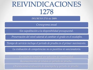 Este documento resume los principales puntos del Decreto 1757 de 2015 sobre la implementación de una Evaluación de Carácter Diagnóstico Formativa (ECDF) para docentes en Colombia. La ECDF reemplazará las evaluaciones de competencias anteriores y tendrá un enfoque cualitativo para impulsar la reflexión y formación docente. Incluirá instrumentos como observación de video, autoevaluación y apreciación de estudiantes, con ponderaciones específicas. Los docentes que no aprueben la ECDF deberán tomar cursos de formación.