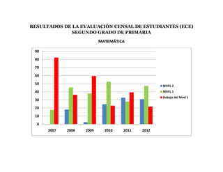 El documento presenta los resultados de la Evaluación Censal de Estudiantes de segundo grado de primaria en comprensión lectora y matemática para los años 2007-2012. Muestra que la mayoría de estudiantes se ubican en los Niveles 1 y 2, pero con diferencias entre secciones. También analiza los resultados por sección, nivel de logro, y factores como ubicación y tipo de gestión que podrían estar relacionados con las diferencias.