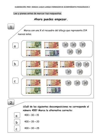 Este documento presenta una prueba de matemática para estudiantes de cuarto grado de primaria. Consiste en 20 preguntas de opción múltiple sobre conceptos matemáticos como descomposición de números, resolución de operaciones, geometría, gráficos y problemas de la vida real. El estudiante debe marcar su respuesta en un recuadro para cada pregunta.