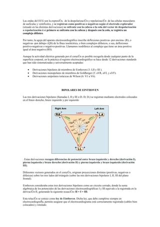 El documento describe cómo las ondas del ECG representan la despolarización y repolarización del corazón y cómo se registran como positivas, negativas o difásicas dependiendo de la orientación del vector eléctrico. Explica las 12 derivaciones estándar utilizadas en el ECG, incluidas las tres derivaciones bipolares de Einthoven (I, II y III) que forman un triángulo eléctrico y deben cumplir la ley de Einthoven donde la suma de I y III es igual a II.