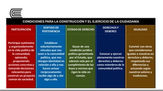Este documento discute las condiciones necesarias para el ejercicio de la ciudadanía, incluyendo la igualdad, la pertenencia a una comunidad, el ejercicio de deberes y derechos, la participación, y el estado de derecho. Explica que la ciudadanía moderna surgió con los estados nación y cómo la noción antigua griega de ciudadanía ha evolucionado con el tiempo y el contexto. El propósito de la unidad es analizar casos donde las condiciones de ciudadanía estén o no presentes.