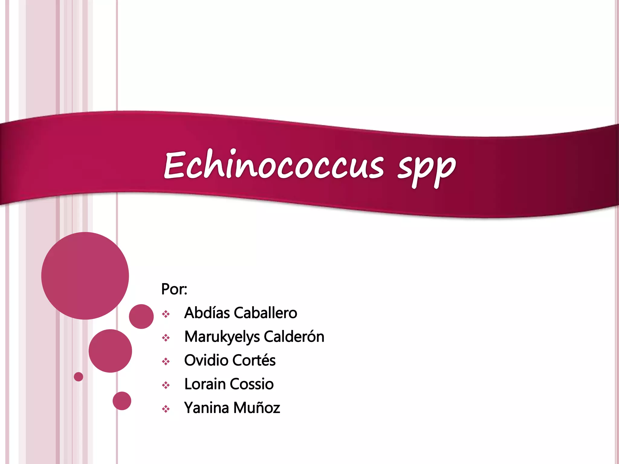 Este documento describe las características de cuatro especies de quistes hidatídicos: Echinococcus granulosus, E. multilocularis, E. oligarthrus y E. vogeli. Detalla sus huéspedes definitivos e intermediarios, órganos que afectan, características microscópicas como la forma del útero y la localización del poro genital, y las enfermedades que causan como la hidatidosis unilocular o alveolar. Incluye múltiples fotomicrografías para ilustrar las diferencias entre