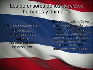 Los defensores de los derechos humanos y animales en Tailandia están sujetos a amenazas, agresiones, detenciones arbitrarias y desapariciones forzadas por parte del gobierno tailandés, que los ve como una amenaza. Además, en Tailandia no se respetan plenamente los derechos de los niños, quienes a menudo sufren discriminación y pobreza que les impide acceder a una educación y salud adecuadas a pesar de los esfuerzos legislativos.