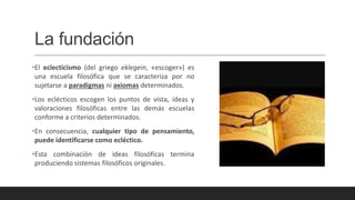El documento describe el eclecticismo como una escuela filosófica que no se sujeta a paradigmas determinados, sino que escoge ideas de diferentes escuelas según criterios propios. Esto puede dar lugar a sistemas filosóficos originales. El eclecticismo también se manifiesta en otras áreas como la religión, la política, las artes marciales, la arquitectura y la psicología. Algunos filósofos eclecticos destacados fueron Marco Terencio Varrón, Marco Tulio Cicerón y Victor Cousin.
