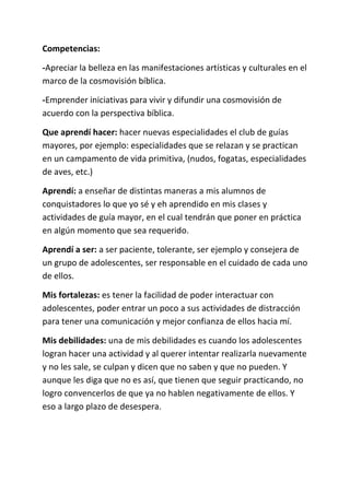 Este documento resume las competencias, habilidades y fortalezas de una guía mayor. Menciona nuevas especialidades aprendidas para campamentos como nudos y fogatas. También aprendió a enseñar de diferentes maneras a los conquistadores y a ser paciente, tolerante y responsable con los adolescentes. Sus fortalezas incluyen interactuar con adolescentes, pero su debilidad es cuando los adolescentes se culpan a sí mismos y hablan negativamente a pesar de sus esfuerzos por animarlos.