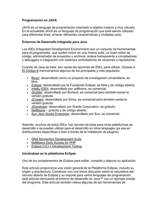 1) El documento describe varios entornos de desarrollo integrados (IDE) para Java, incluyendo Eclipse, NetBeans, y BlueJ. Eclipse es de código abierto y soporta múltiples lenguajes además de Java. 2) Se explica cómo crear y ejecutar un programa "Hola Mundo" simple en Eclipse usando el entorno de desarrollo de Java. 3) Eclipse provee funciones como resaltado de sintaxis, autocompletado, y depuración para facilitar el desarrollo de aplicaciones Java.