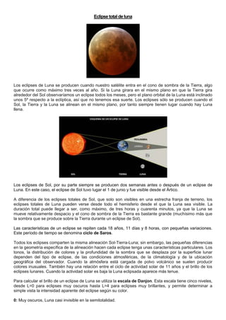 El documento describe un eclipse total de Luna que ocurrirá esta noche. Explica que los eclipses lunares ocurren cuando la Luna entra en la sombra de la Tierra. Aunque la Luna entre completamente en la sombra, no se oscurece totalmente sino que toma un color rojo ladrillo debido a la luz que recibe de la Tierra filtrada a través de la atmósfera. Este eclipse no podrá verse completamente ya que la Luna saldrá ya eclipsada. El próximo eclipse total visible en su totalidad en el país será el 28 de septiembre