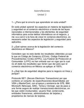 Este documento presenta las reflexiones de una estudiante sobre la unidad 2 de su curso de comercio electrónico. La estudiante discute 3 puntos clave: 1) Aprendió sobre la legislación y seguridad en comercio electrónico que le servirá para crear su propio negocio en línea. 2) Opina que la legislación de comercio electrónico en México aún no ha logrado resultados completos. 3) Elegiría el protocolo SET para la seguridad de su negocio en línea debido a que proporciona una forma segura