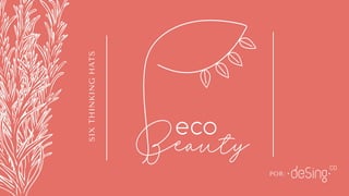 Este documento presenta la metodología Six Thinking Hats para el desarrollo de una marca de maquillaje sostenible. Se resumen datos estadísticos sobre el impacto de la industria cosmética, y se identifican problemas como el desperdicio, pruebas en animales y uso excesivo de plástico. El objetivo es promover un consumo consciente mediante un servicio personalizado y rápido que minimice el impacto ambiental. Se analizan proveedores, público objetivo, factores innovadores como paneles solares, y posibles benef